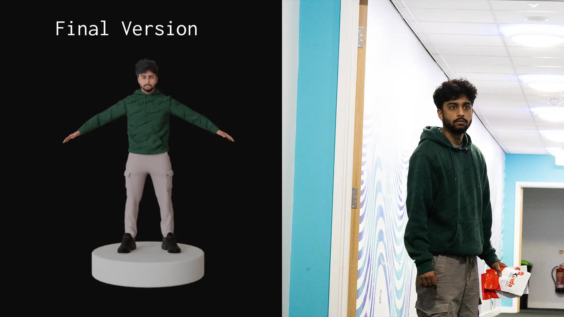 anything. (2025) is a short film directed by myself (see film & editing for more information on the whole film). As part of my Final Major Project for university, I created a digital double of one of the actors using a 3D scan as a base. I then proceeded to retopologise and clean it up in Blender, made clothes using Marvelous Designer and then did a destruction and ragdoll simulation using Blender plugins, which I then composited with Production Crate dust assets using After Effects. This isn't the final version of the shot, as that will be done once the edit is locked, but it's a good first draft of what it could look like!